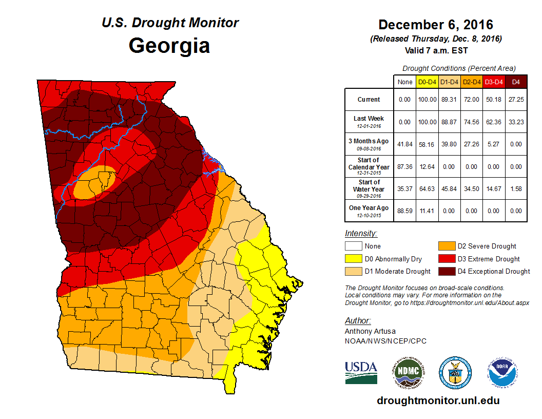 Overall, this is the worst drought the state has seen since late 2016. During that time, many wildfires ravaged the northern and central parts of the state, and a large area fell into the D4 exceptional category. That drought was the opposite of the current with North Georgia feeling the worst effects, and south Georgia being relatively in good shape.