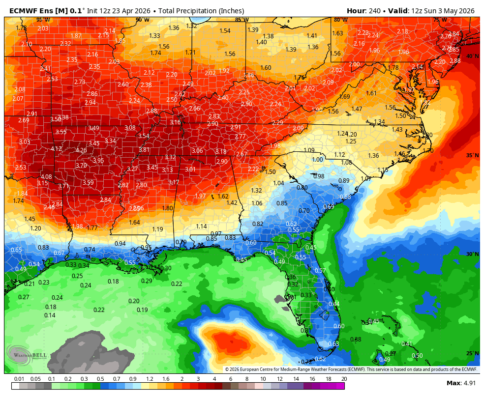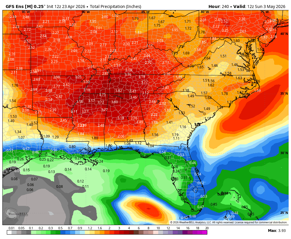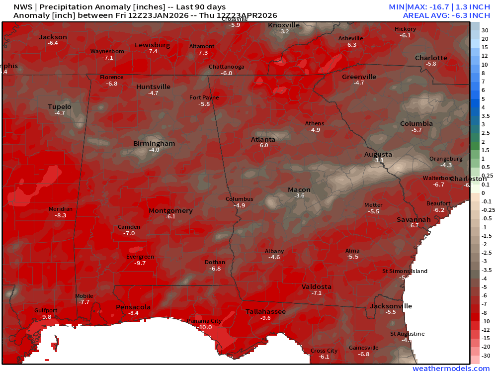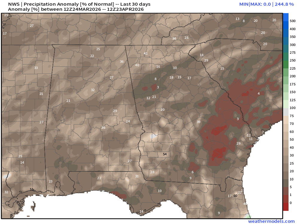 This is backed up by the weather models, which show an initial round of rain this Saturday and another round on next Tuesday/Wednesday as a pair of weak fronts move through. Still, the bulk of this rain is expected to be situated across Northwest Georgia with less falling the further southeast you live. Still, they are in remarkably good agreement that we will see 1-3″ fall across the northern 2/3 of the state in the next 10 days.