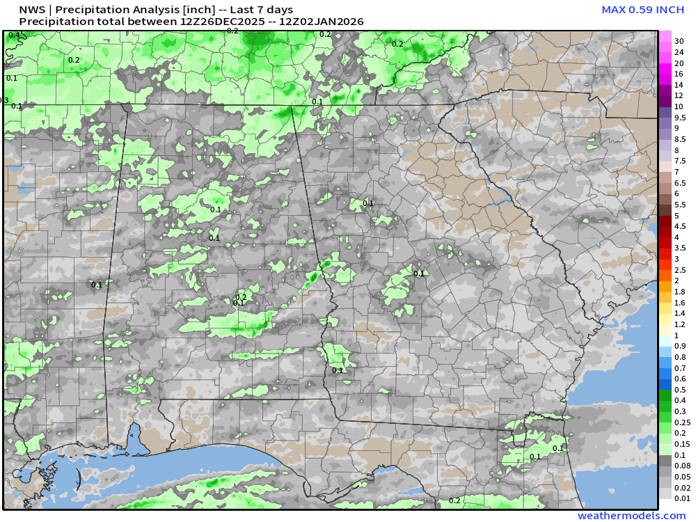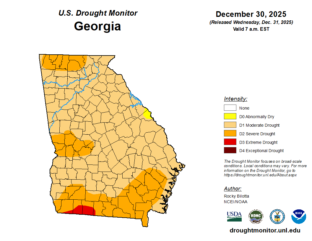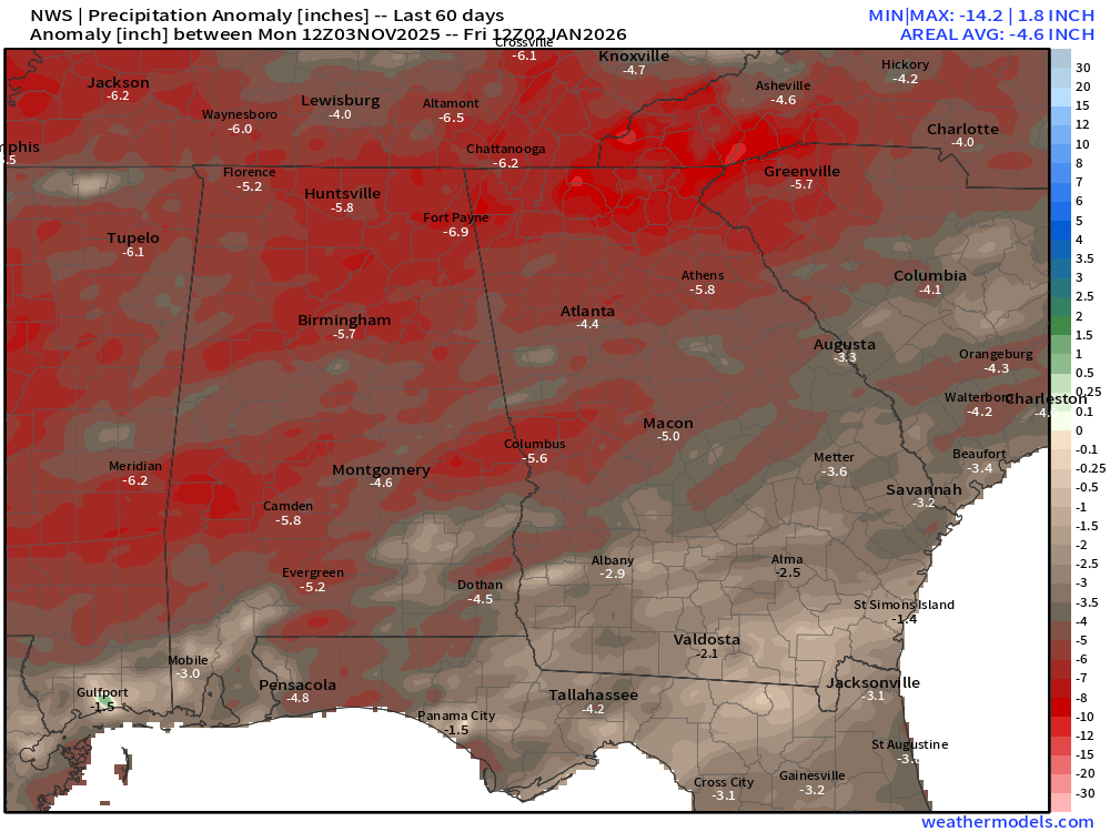 60-day deficits look even worse, with sections of Northeast Georgia showing 8-10″ below average since the beginning of November. Central Georgia has fared only slightly better with a handful of Gulf systems and deficits in the 4-7″ range. Far south Georgia, where an extreme drought was underway just a couple months ago, have seen significant improvement.