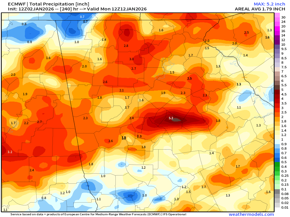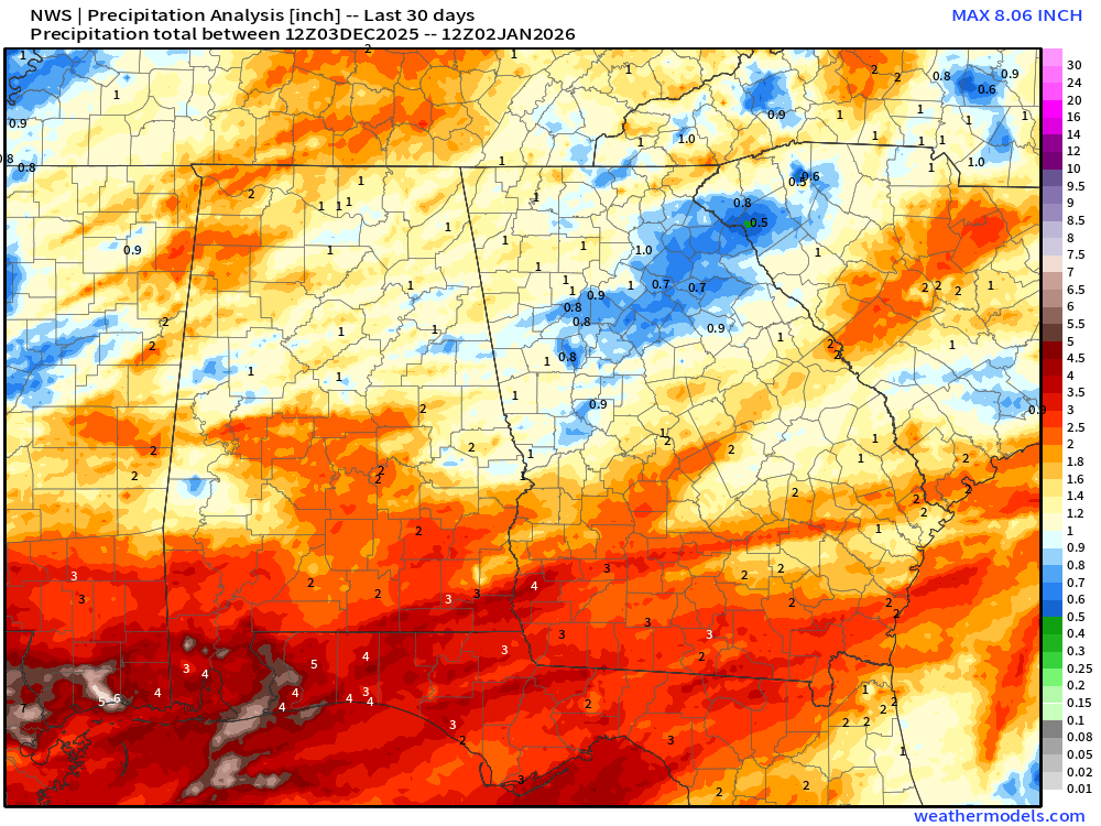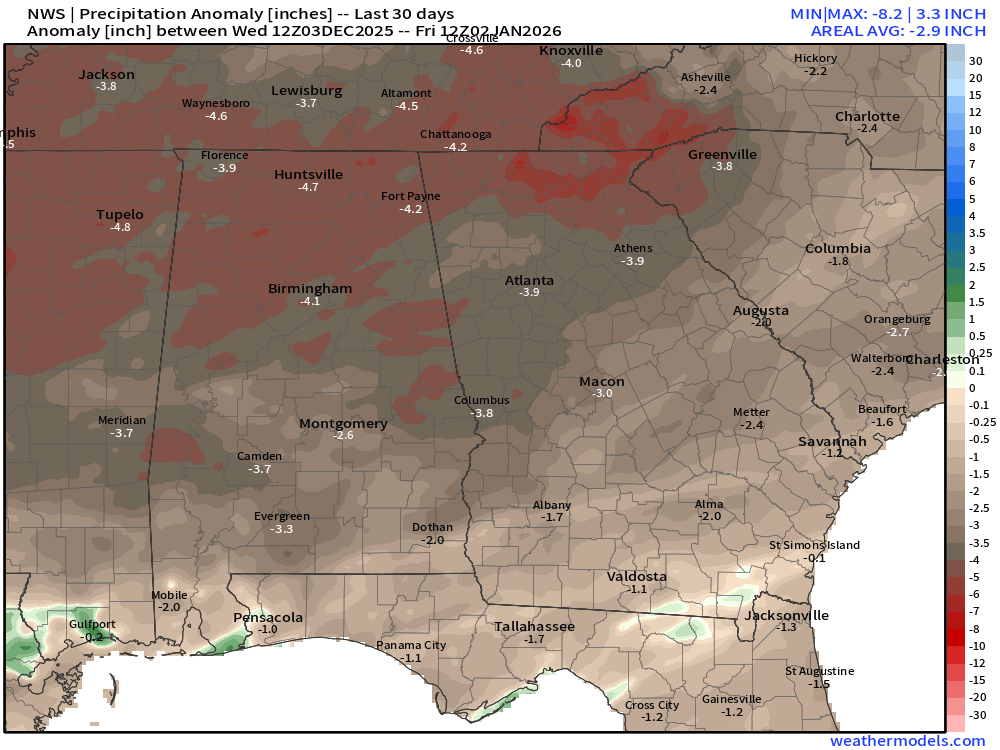 This is bad timing since December into January is the wettest time of the year for the majority of the state. Monthly averages for both December and January range from 4″ over central Georgia to as much as 6″ over the mountains. This has driven our rainfall deficits significantly higher with 30 day deficits around 3-6″ across the northern half of the state.