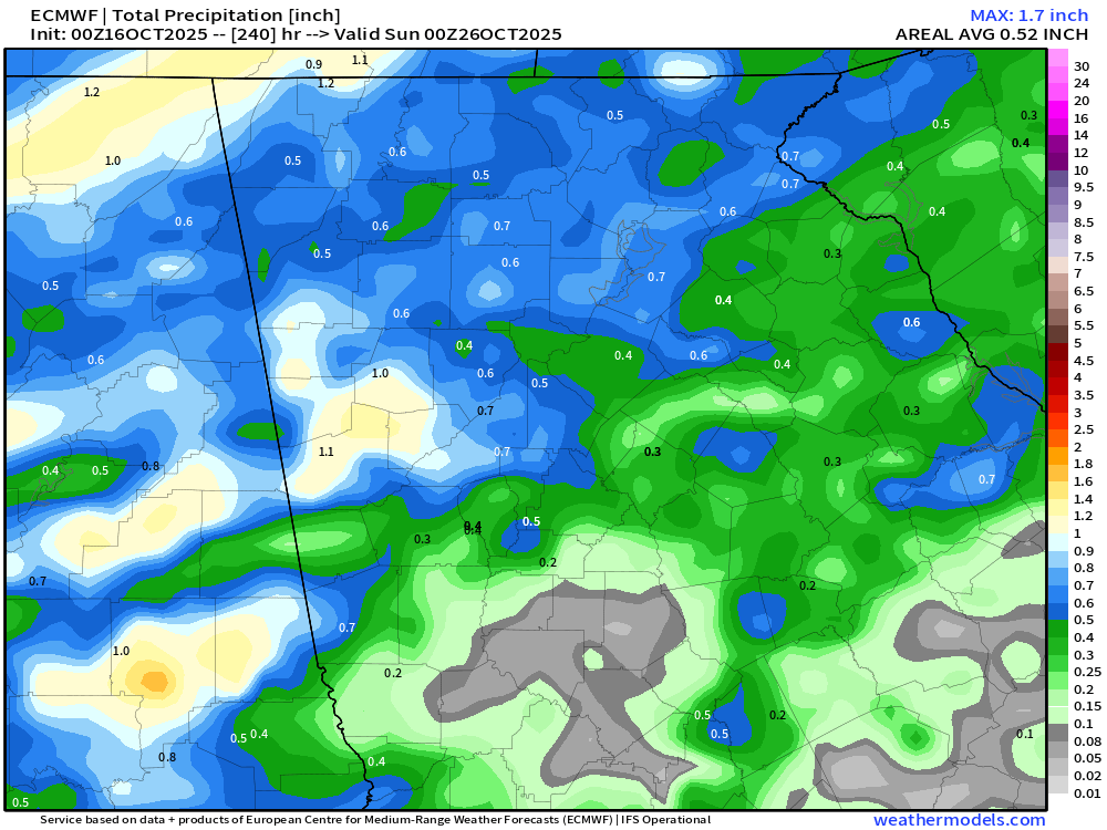 Unfortunately, it appears we will continue to remain mostly dry for the next 7-10 days. A cold front will bring some showers to the region on Sunday, but currently those are expected to be quite light with 1/2″ or less for most of us. Weather models are still a bit split, with the Euro bringing higher totals, but in general the front does not look overly impressive.