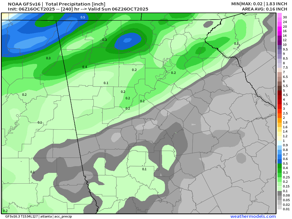 Much of South Hall, Forsyth, Banks and all of Jackson Counties are now in a D1, or moderate drought. Since last week’s update, no rain has fallen across the majority of the state. Some spots in Northwest Georgia did see some showers last Thursday, but since then the only rain has been along the coast. The image below shows the past 7 days of rainfall. Note the extremely high totals over central South Carolina where the drought was erased in that region.