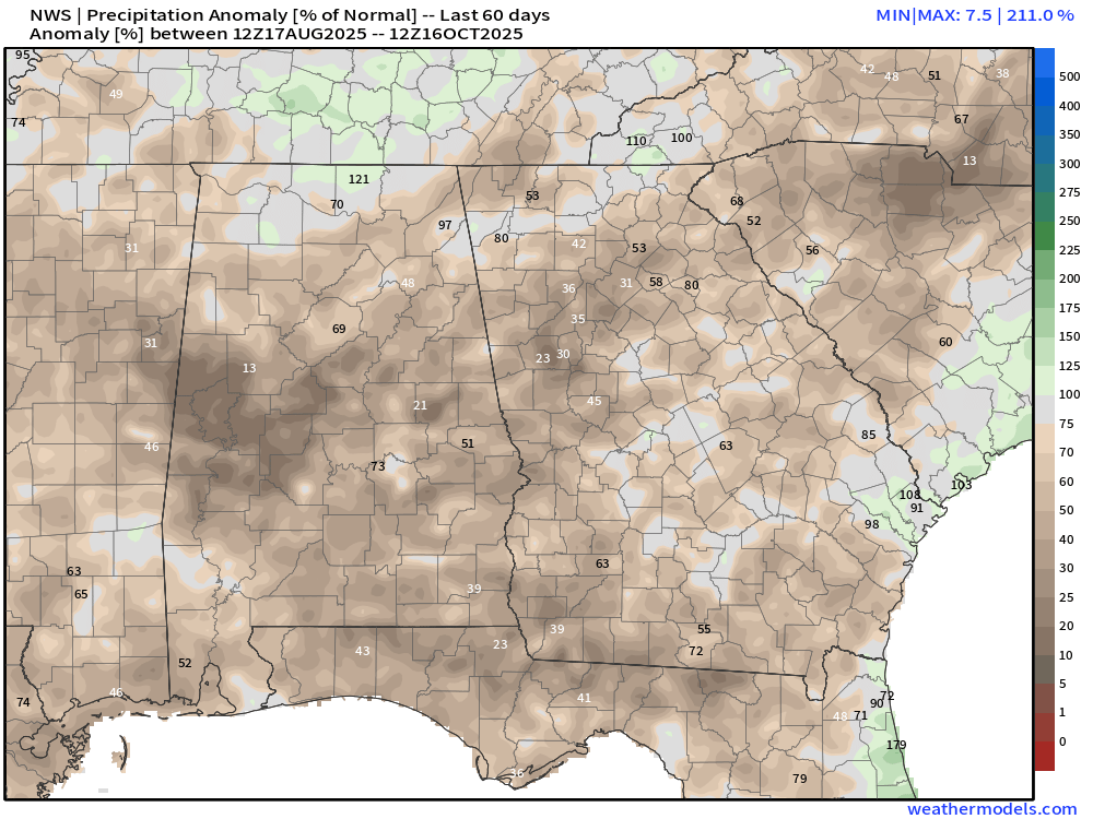 Overall, the total area of Georgia in a drought did decrease by about 1%, but all categories from D1-D3 saw expansions. Far southwest Georgia is in by far the worst shape with widespread extreme drought. Below you can see what percentage of normal rain has fallen in both the past 30 and 60 days. While there are some areas that have seen normal rainfall, they are extremely spotty and in many cases completely surrounded by spots that didn’t. The nature of afternoon storms in late summer without any tropical input lends itself to this type of situation.