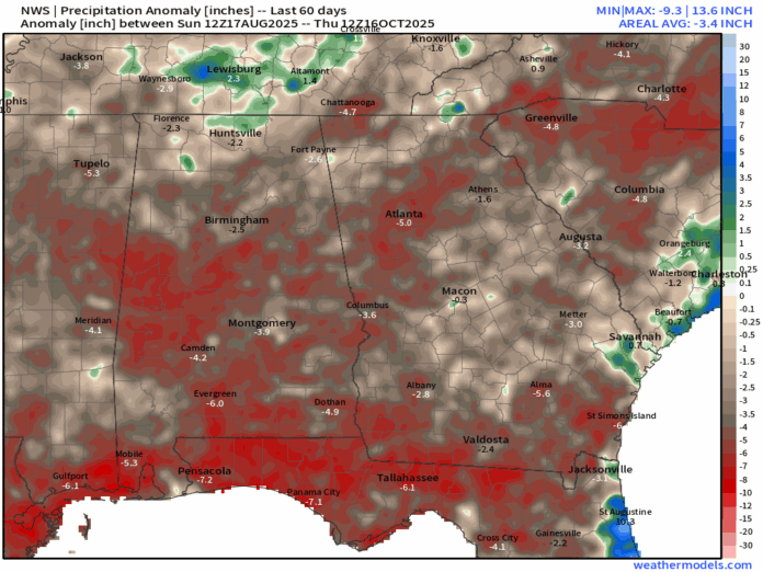 As far as rainfall deficits go, those are also quite spotty. The area right along the I-85/985 corridor and up 441 currently have the biggest departures, around 3-5″ in the past 60 days depending on exact location.