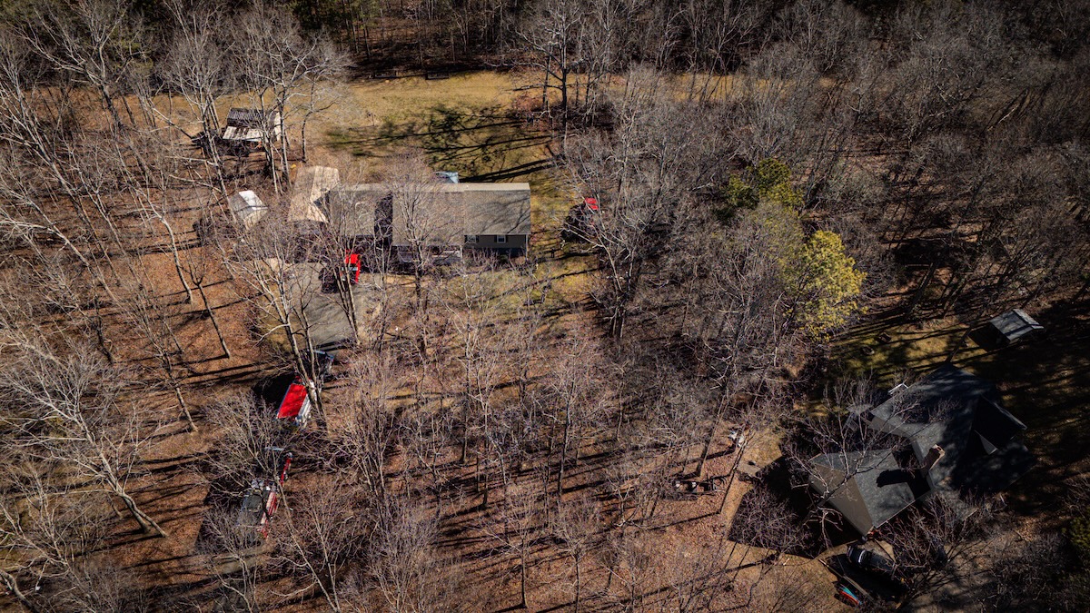 An aerial view shows the charred woods near several homes in the area. (Daniel Purcell/NowHabersham.com)