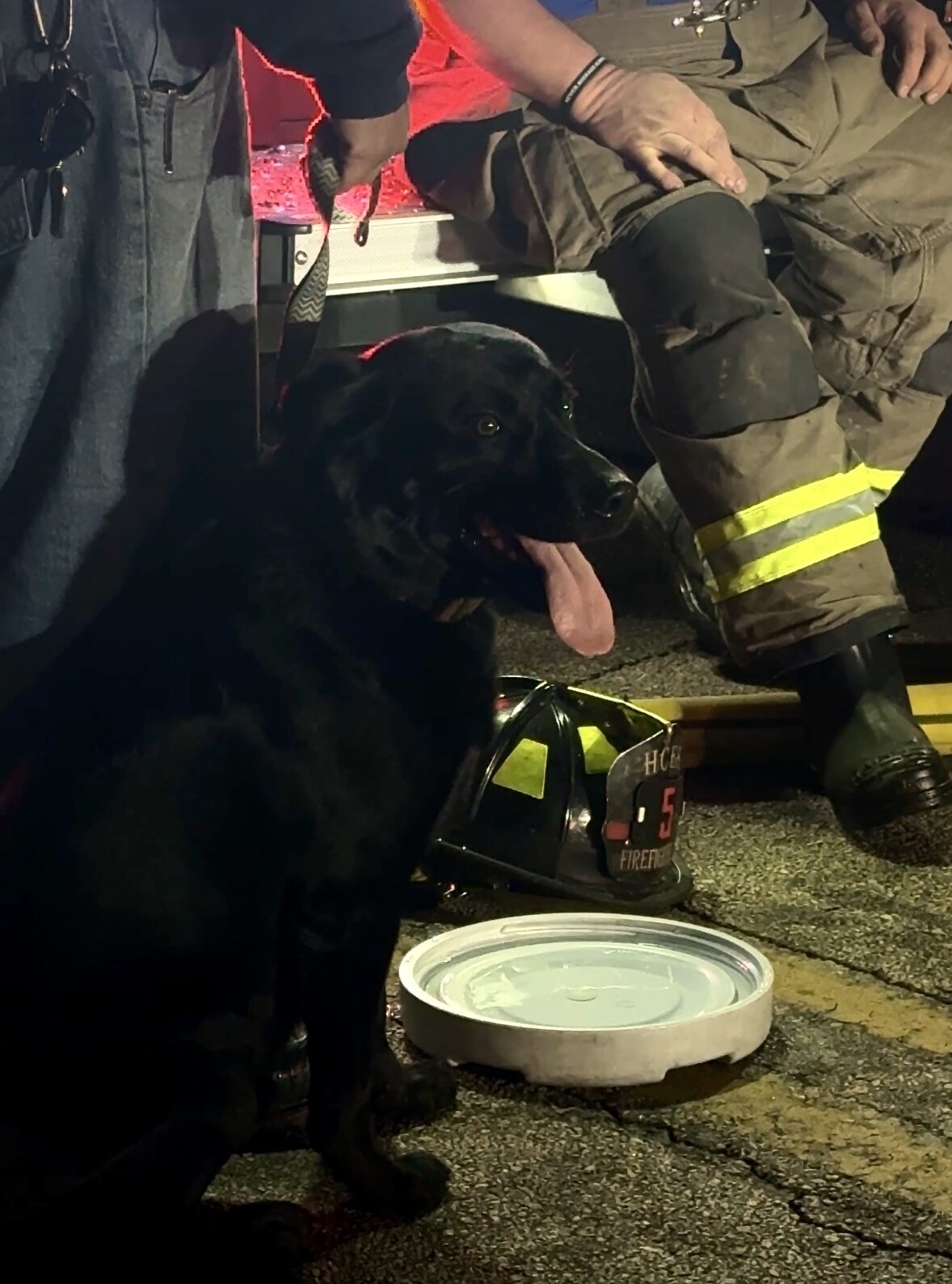 A dog from the Robertson Loop residence rests safely beside firefighters following the early morning fire.