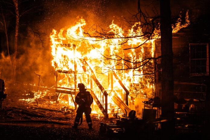Heavy flames consume a Clarkesville home in the early morning hours Friday as a firefighter advances a hose line toward the fully involved structure on Robertson Loop Road. (Daniel Purcell/NowGeorgia.com)