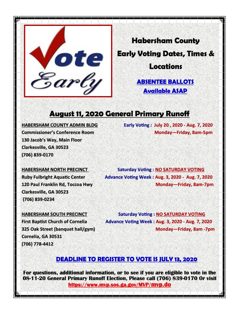Beginning Monday, July 20, the Habersham County Elections Office will hold in-person early voting from 8 a.m.-5 p.m. weekdays in the Commissioner’s Conference Room of the main floor of the Habersham County Administration Building in Clarkesville.