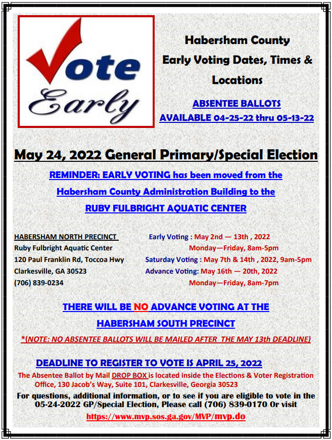 The Habersham County Board of Elections has announced the official early voting dates, as well as a voting precinct change, for the May 24 election.