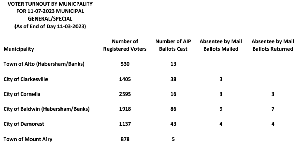 After polls closed on Friday, only two cities had a voter turnout of more than 3% of registered voters casting a ballot during the early voting period. Those cities that had more than 3% voter turnout were Baldwin (4.8%) and Demorest (3.8%). Two cities had less than 1% voter turnout during early voting. Cornelia and Mt Airy both closed early voting with only 0.6% voter turnout (see the breakdown below).