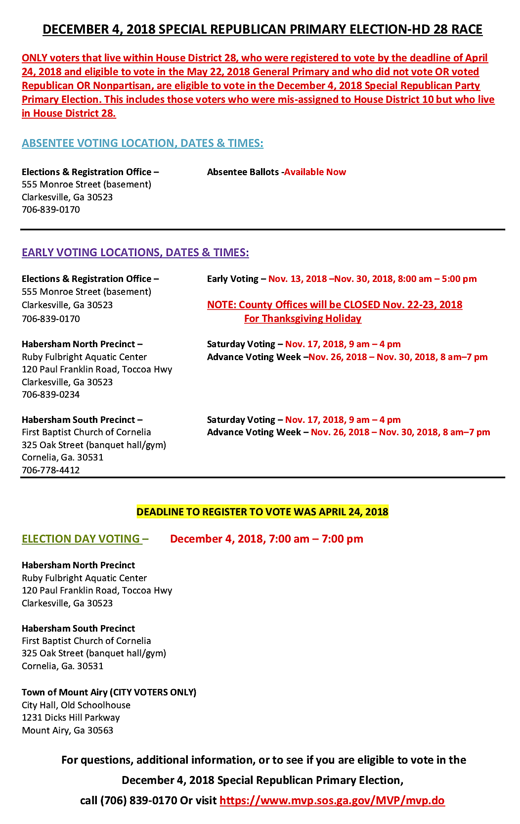 Early voting got underway today in the rerun of Georgia’s State House District 28 Republican Primary. A judge ordered a repeat of the May 22 GOP Primary between incumbent Rep. Dan Gasaway and challenger Chris Erwin after Habersham County admitted districting errors that resulted in illegal votes being cast.