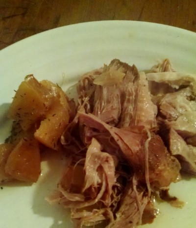 It really is so easy. Grab your crock pot. If you don’t have a crock pot, a deep dutch oven or any type of deep, oven-safe pan will do. Take the pork loin, it does not matter what size it is. Place the pork loin, fat side up, in the pan or crock pot. Slice up one or two of your favorite apples. I used Fuji this time. Also chop up one or two onions, not too many. My default onion is vidalia but any would be fine. Place the apples and onion in the pan with the pork. Take some dried thyme, about a tablespoon, and shake over the ingredients. Then I took a half gallon of apple cider. At Ingles, I get the cider over in the produce section, but any will do. Cover the pork with the cider as high as your dish will allow. Here is what mine looked like. Set the crock pot for 10 hours, cover and forget it. If you are doing the reci