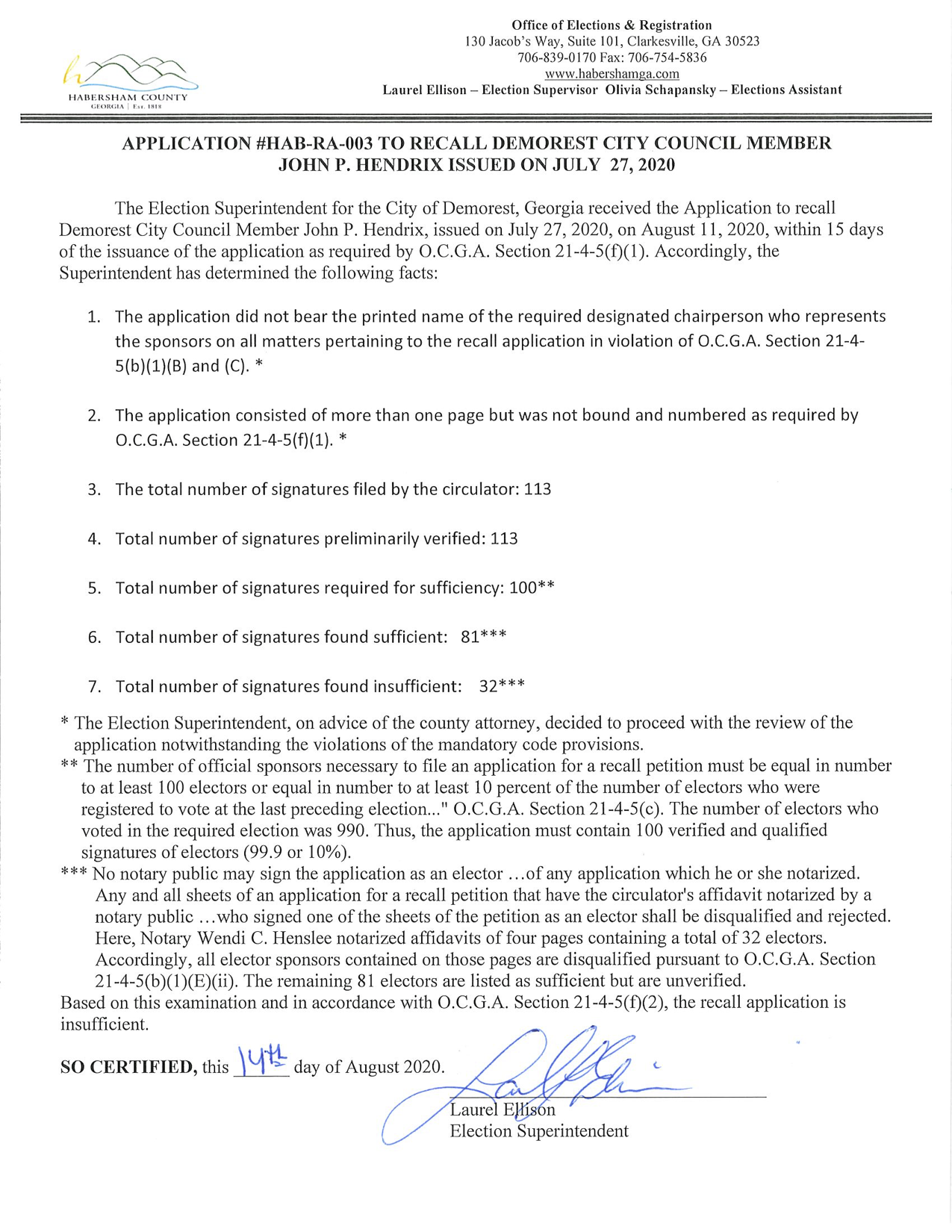 Ellison threw out 35 names on the recall application for Nathan Davis and 32 names on Hendrix’s application because notary Wendi C. Henslee signed the applications as a voter and then notarized them. A copy of the Recall Act of 1989 which Ellison provided to Now Habersham clearly states “No notary public may sign the application as an elector.”