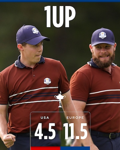 Europe swept all four team sessions for the first time since its 2006 win at The K Club in Ireland. At stake Sunday is a chance to break the record for the biggest rout — 19-9 by the Americans at Whistling Straits in 2021.