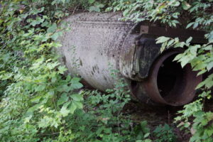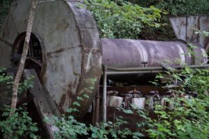 Finally, at the northern entrance, right after crossing the river over the pedestrian bridge, take the gravel path to the left. The remnants of the mining operation of the Plattsburgh Mining Company of New York can be seen. Plattsburgh bought a section of land in 1895 and began mining for gold in 1896. The location offered low-grade gold, but with equipment that included a steam ten-stamp mill to remove the gold from rock, the company was very profitable.