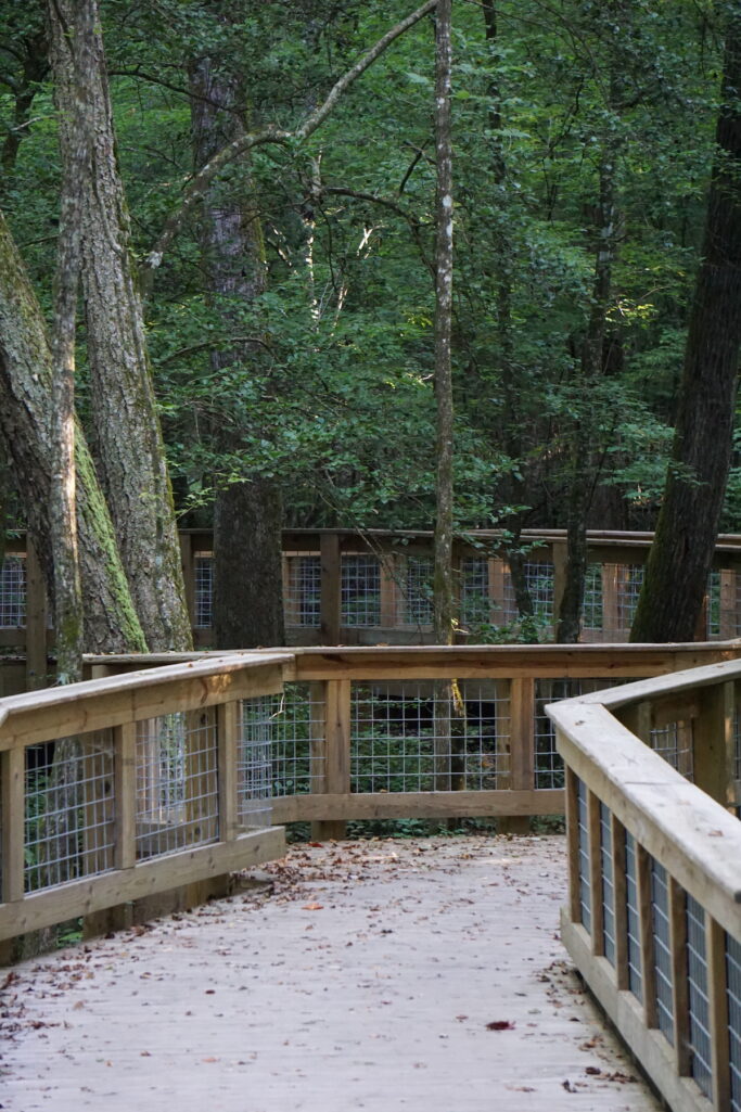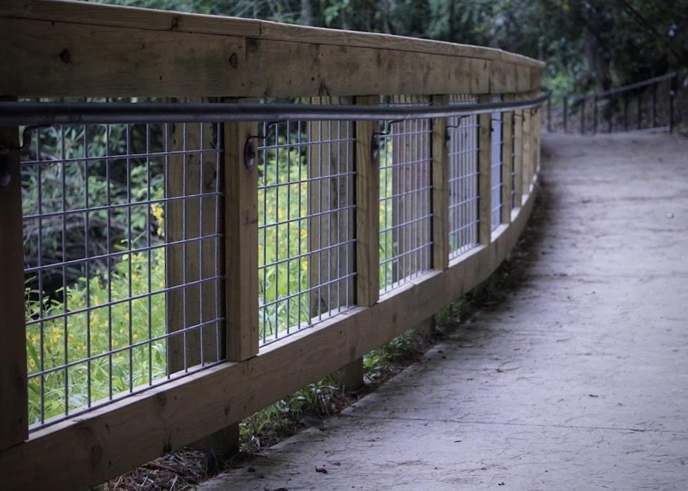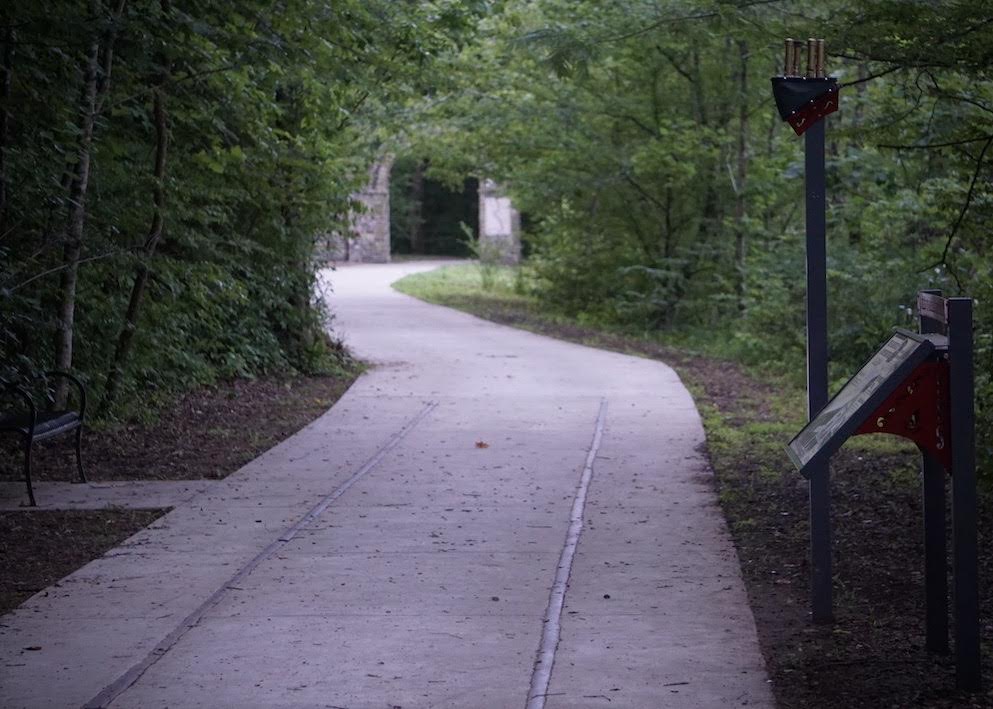 Next, near the northern entrance of the trail, some of the original tracks from the Gainesville & Northwestern Railroad can be seen embedded into the concrete pathway. The railroad was begun in 1911 by A.R. Byrd and C.D. Matthews, the owners of the Byrd-Matthews Lumber Company to transport logs to Gainesville from Helen. The railroad took ten train carloads of logs a day (about 100,000 feet of timber) down the 35-mile track. Both the railroad and the lumber company were operational by 1913. In 1915, two passenger cars were added to the train as well, allowing passengers to go to Cleveland or Gainesville for a day of shopping. The old depot is now the site of the visitor’s center at Hardman Farm State Historic Site.