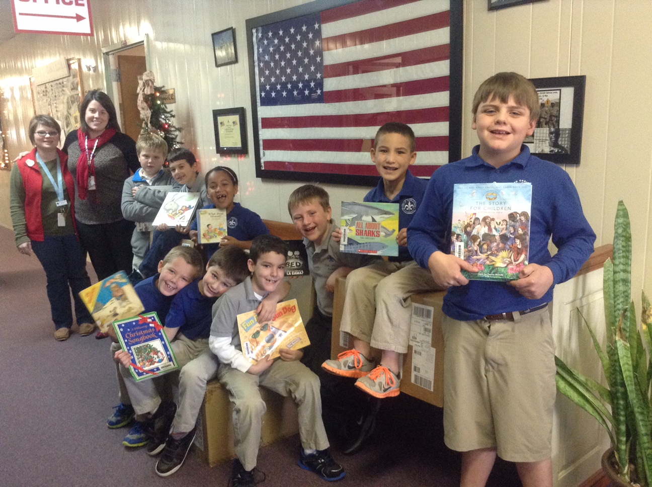 Pictured upon and around the boxes of donated books are Mrs. Wrenn’s second and third grade students. They’re joined in the photo by their teacher and FCA principal Ansley Green.