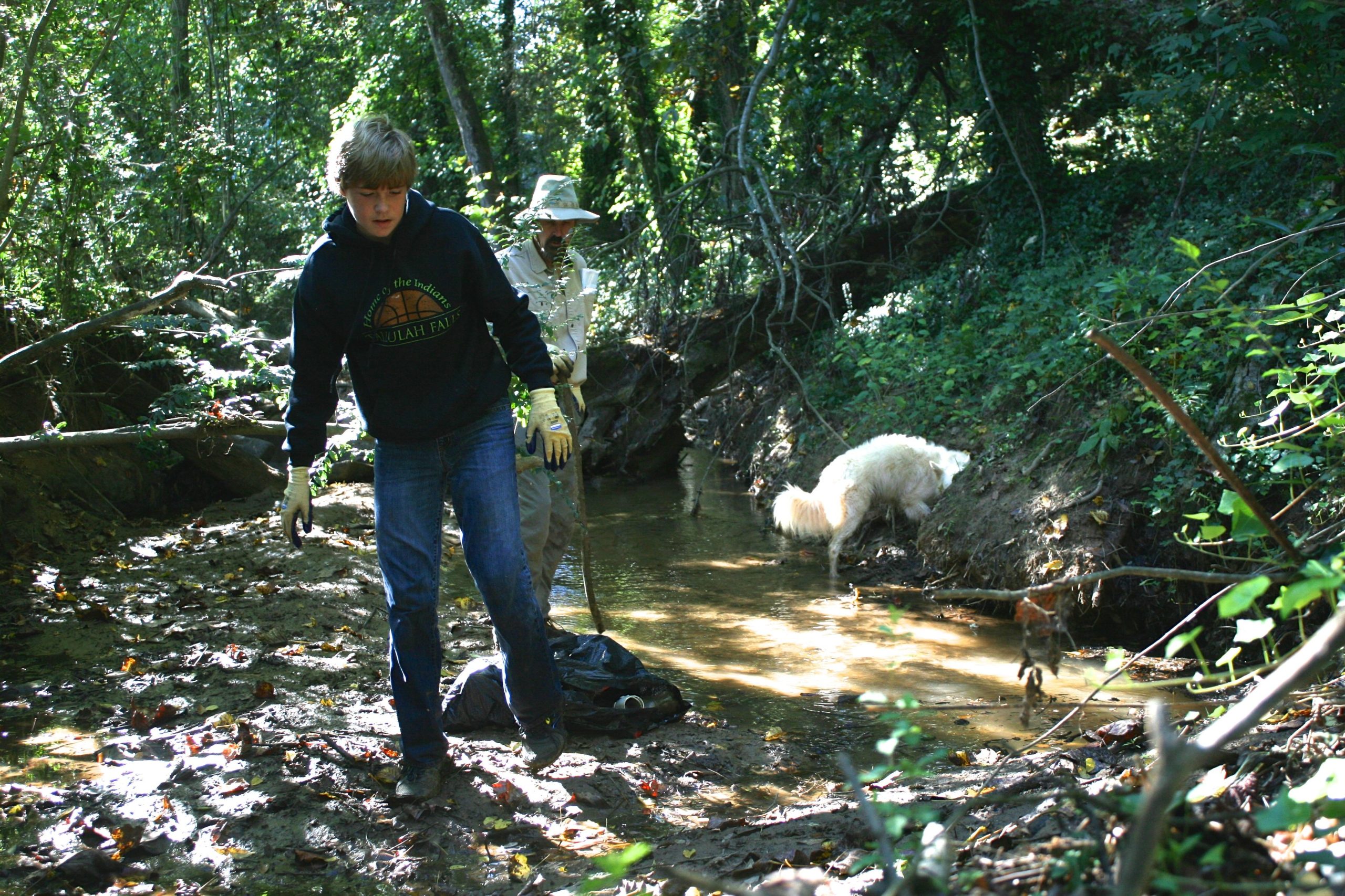 In the above photo, Rivers Alive clean-up volunteers survey beaver dams in Rocky Branch behind Mary Street Park. In addition to picking up nearly 200 pounds of trash, the volunteers removed two beaver dams causing erosion to the stream bank. From left are, Genevieve Summers, Justin Ellis, and Andrea Harper. (click on photos to enlarge images)
