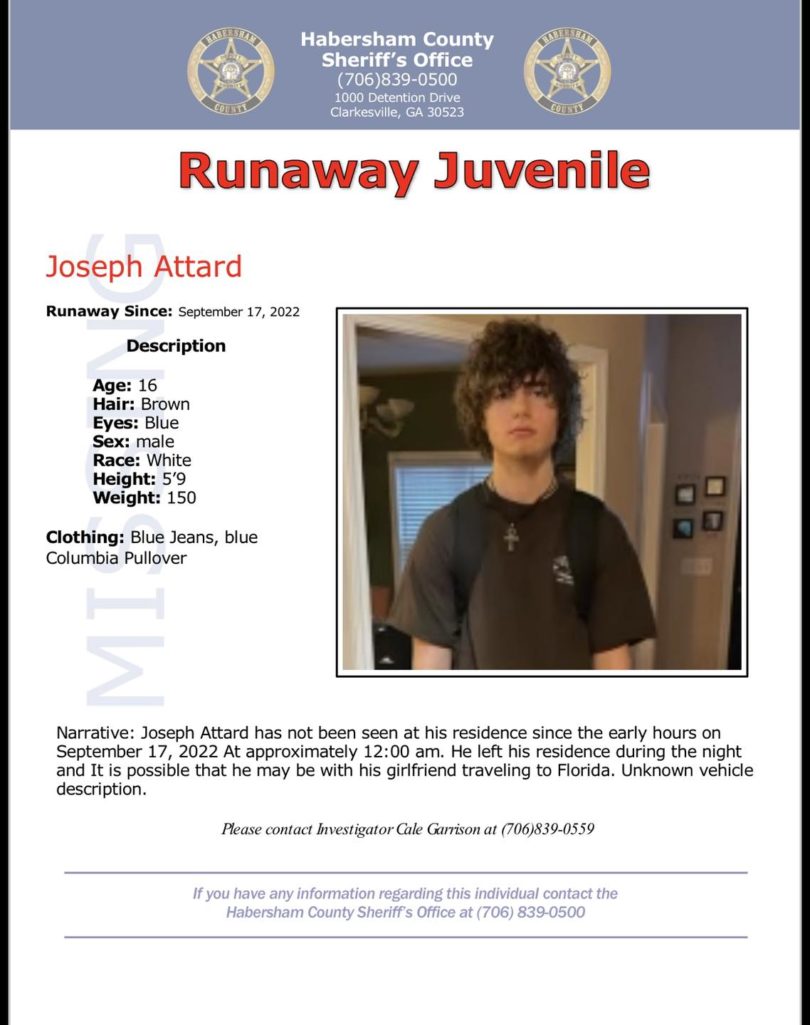 Family members say Joseph Attard, 16, of Cornelia, and his girlfriend Dorothy Krei, 16, of Clarkesville, ran away from home this past weekend. They were last seen in Habersham County around 1 a.m. on September 17 with two of Dorothy’s friends at Pitts Park in Clarkesville, says Attard’s mom, Penny Welborn.