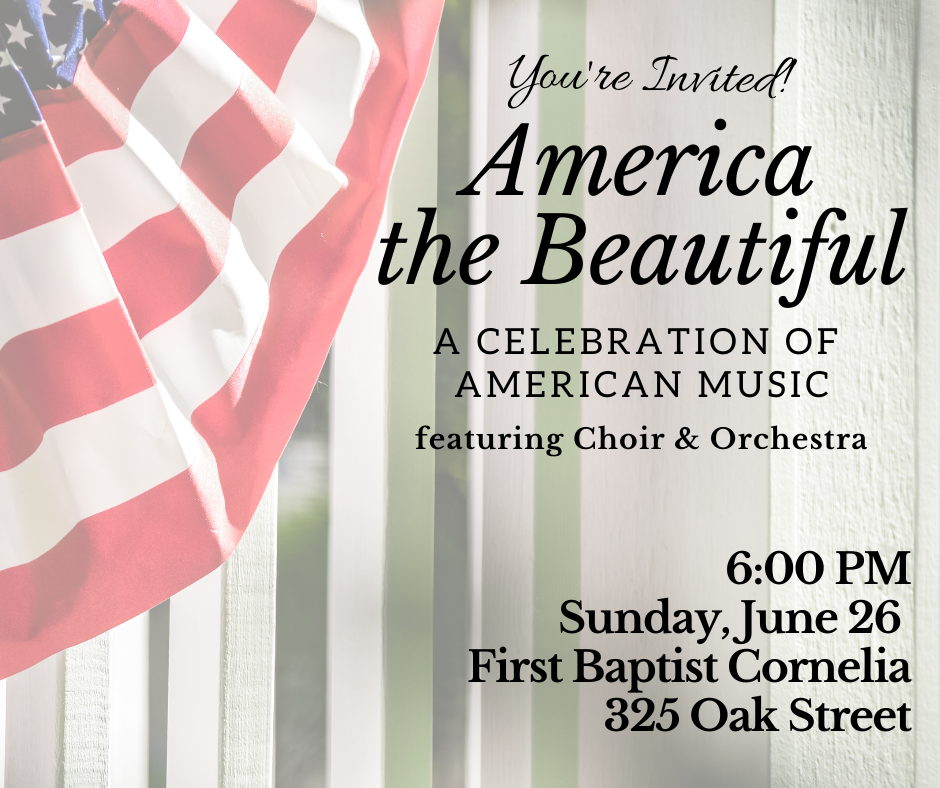 America, the Beautiful: A Celebration of American Music, is scheduled for 6 p.m., Sunday, June 26, at FBC Cornelia located at 325 Oak Street.