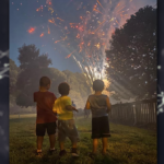 Three young friends watch in awe as fireworks explode over Pitts Park.