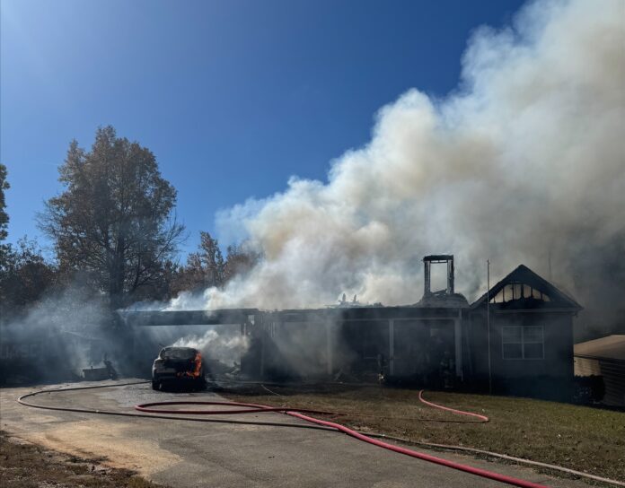 Fire destroyed this house in the 4700 block of Hwy. 52 south of Lula on Tuesday afternoon, November 4, 2025. (Photo by Hall County Fire Rescue)