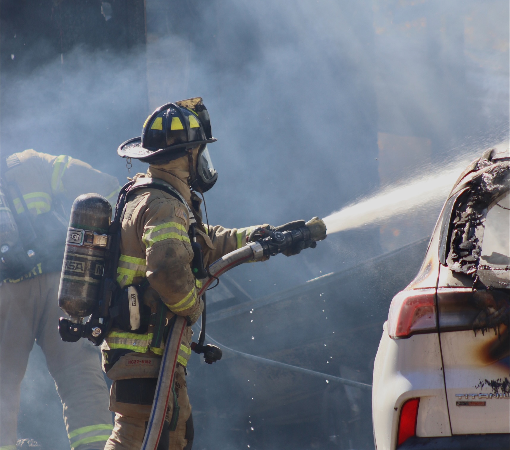 A firefighter with Hall County Fire Rescue hoses down the burning house and vehicle. The residents and a family pet escaped the fire unharmed. (Photo by Hall County Fire Rescue)