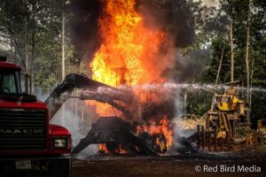 Firefighters from Habersham County Emergency Services and Lee Arrendale responded. Law enforcement officers arrived first on the scene and found a tree skidder engulfed in flames. The blaze threatened to spread to the nearby woods and logging equipment.