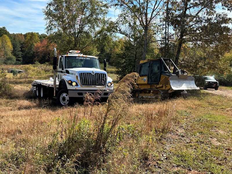 A Georgia Forestry Commission dozer prepares to make its way to Monday’s woods fire off Pea Ridge Road. (Rob Moore/Habersham County)