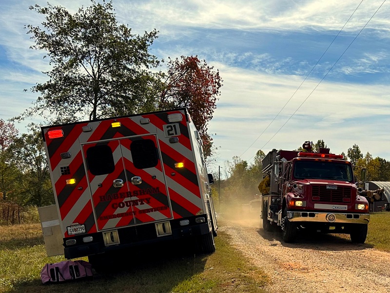 Habersham County Emergency Services Tanker 12 passes Med 21 while on the way to get additional water for Monday’s firefighting effort off Pea Ridge Road. (Rob Moore/Habersham County)