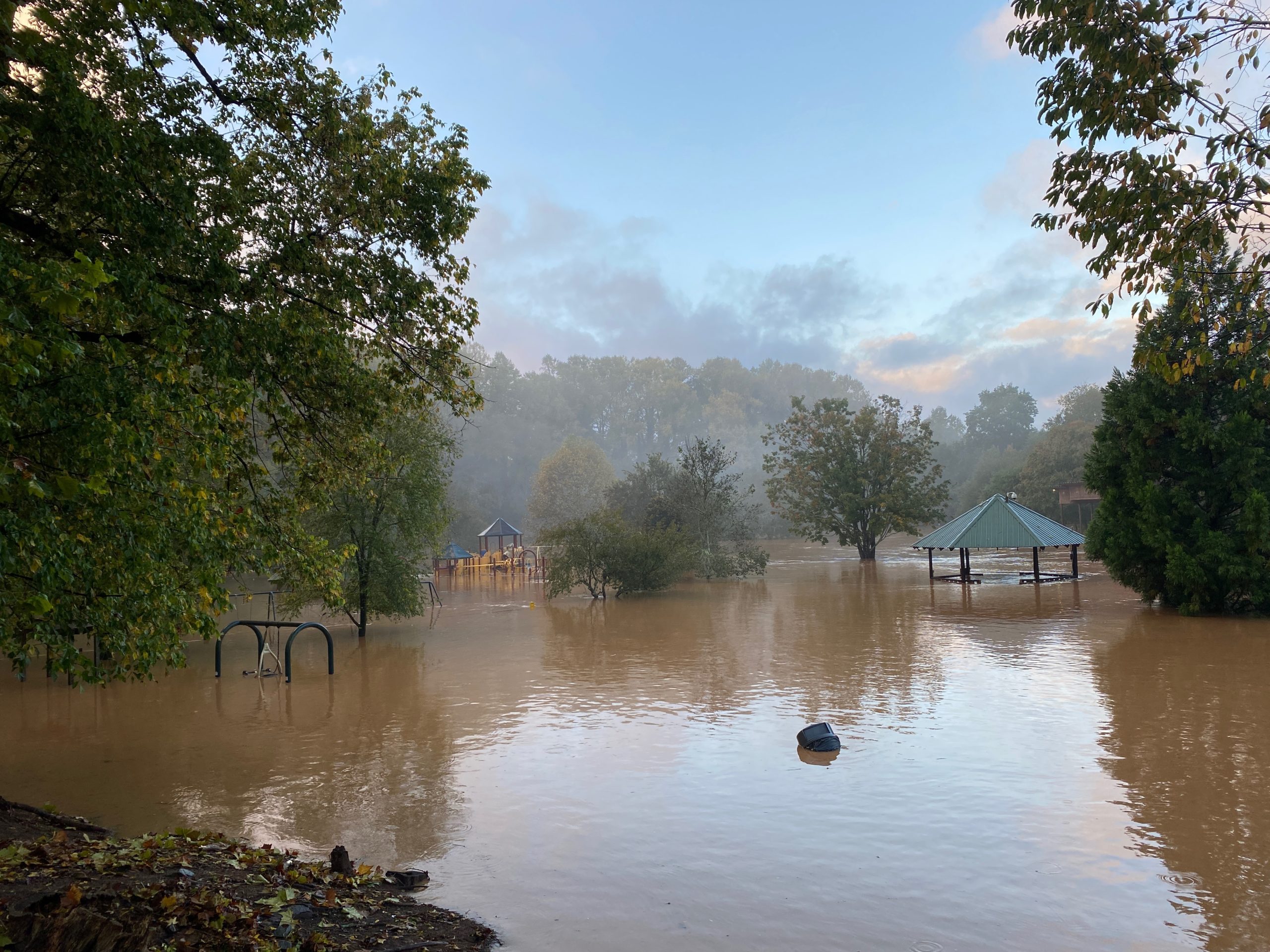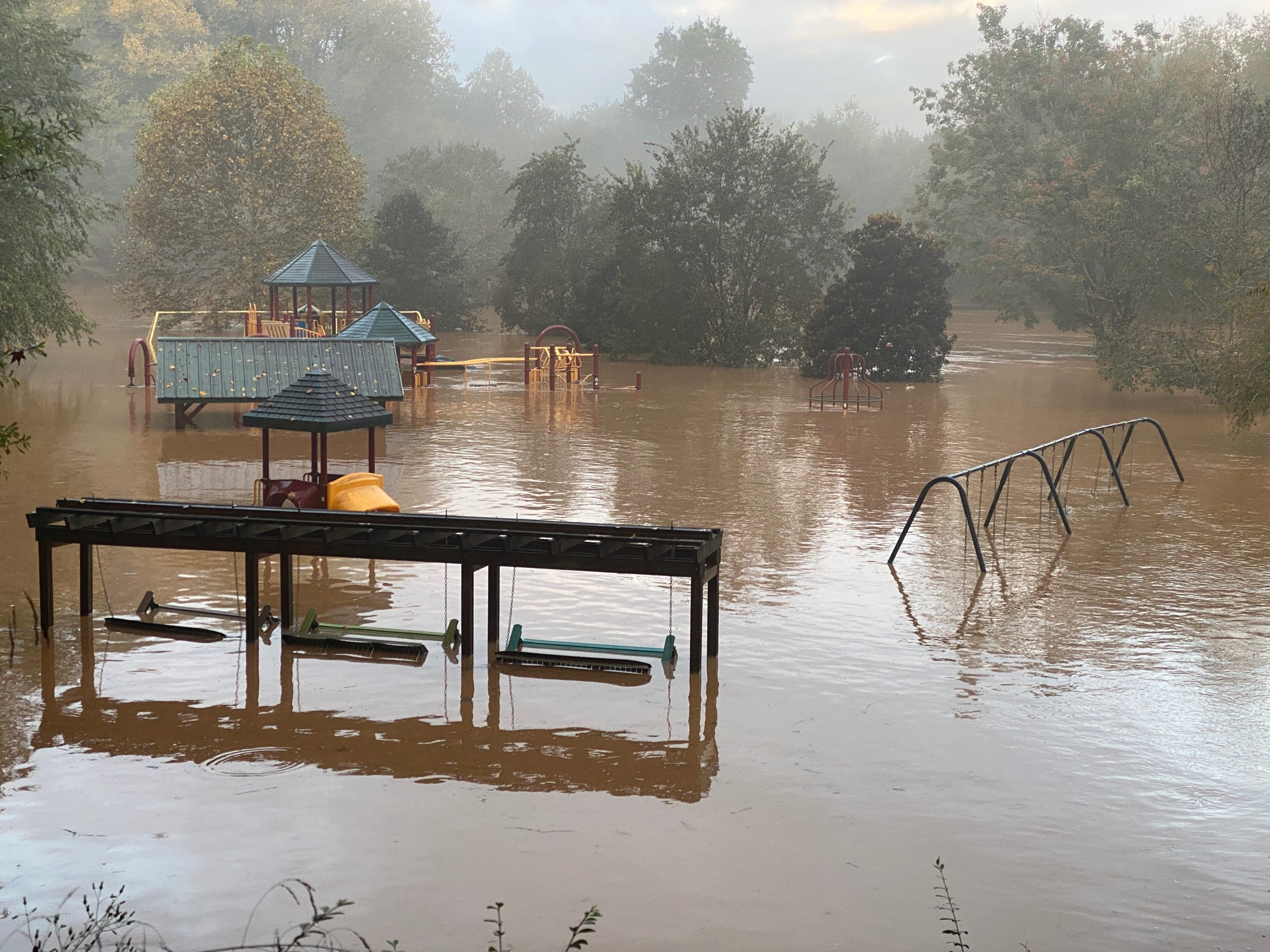 Pitts Park in Clarkesville, which is known for flooding after heavy rains, is completely underwater with only the tops of swingsets and pavilions showing. The Soque River overran its banks and flooded not only the park but the nearby sod farm and Beaver Dam Road. There are reports of flooding in the Soque Trails subdivision in Demorest, as well.