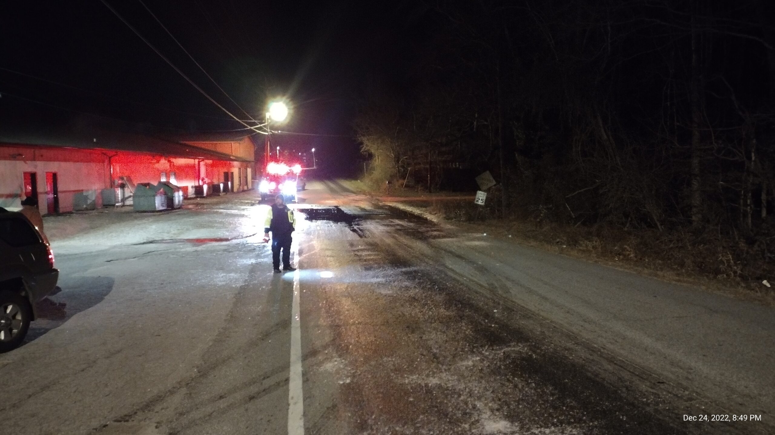 Water draining from the back of the stores flowed onto Highway 75 and caused dangerously icy road conditions. A White County Fire Rescue crew alerted passing motorists to the hazard as a county road crew treated the highway.
