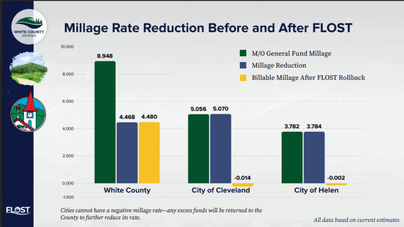 Canupp said the current General Fund Millage rate for the unincorporated areas of White County is 8.98. If the sales tax is approved, the millage rate would be reduced to 4.48 mills, and city residents would see a zero millage rate.