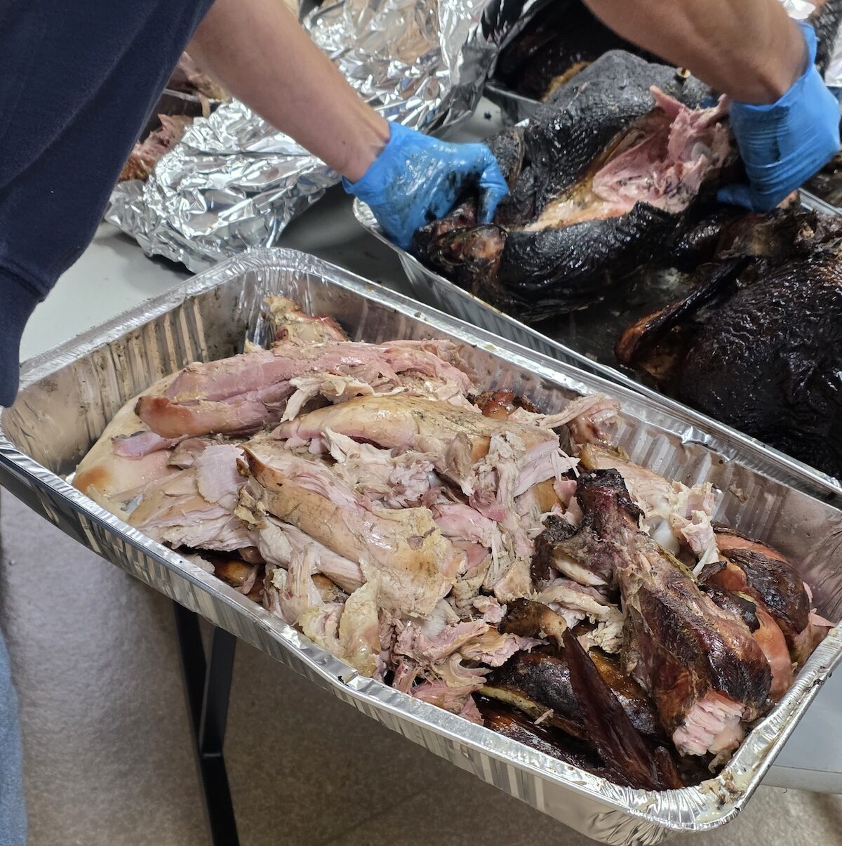 Donations came early this year — turkeys, broth, flour, sugar, oil, and gallons of sweet tea — many collected by Sherry Smith at the Clarkesville Dairy Queen. Today, volunteers poured in by 7 a.m. to start carving the 35 turkeys Holbrooks had smoked and to prepare the rest of the Thanksgiving feast.