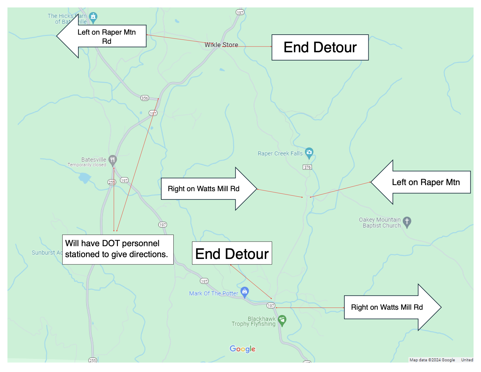 Northbound traffic on GA 197 will turn right onto Watts Mill Road, continuing between Blackhawk Trophy Flyfishing and Mark of the Potter. Then, the detour will take drivers left onto Raper Mountain Road, returning to GA 197 near the old Wikle Store.