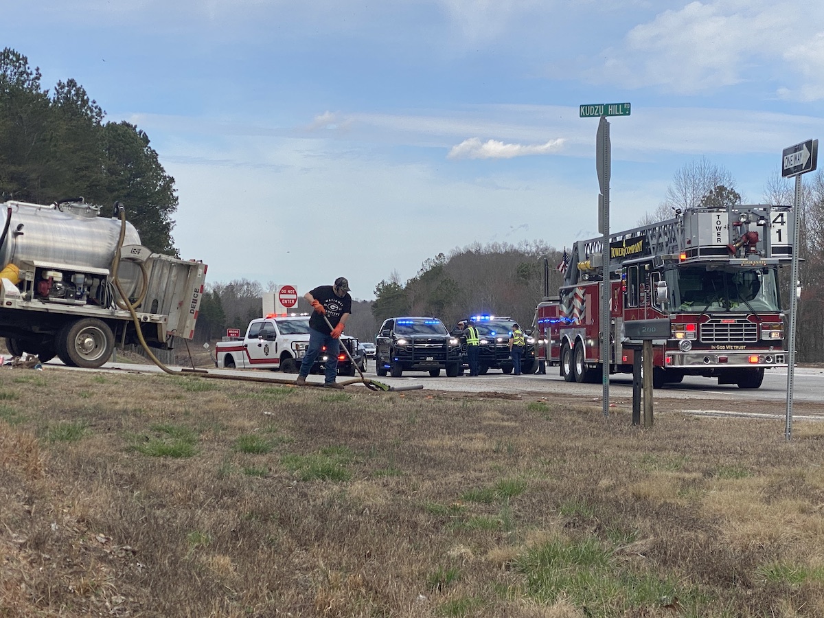 Southbound traffic on GA 365 in Baldwin was briefly disrupted when treated sewage spilled onto the highway.