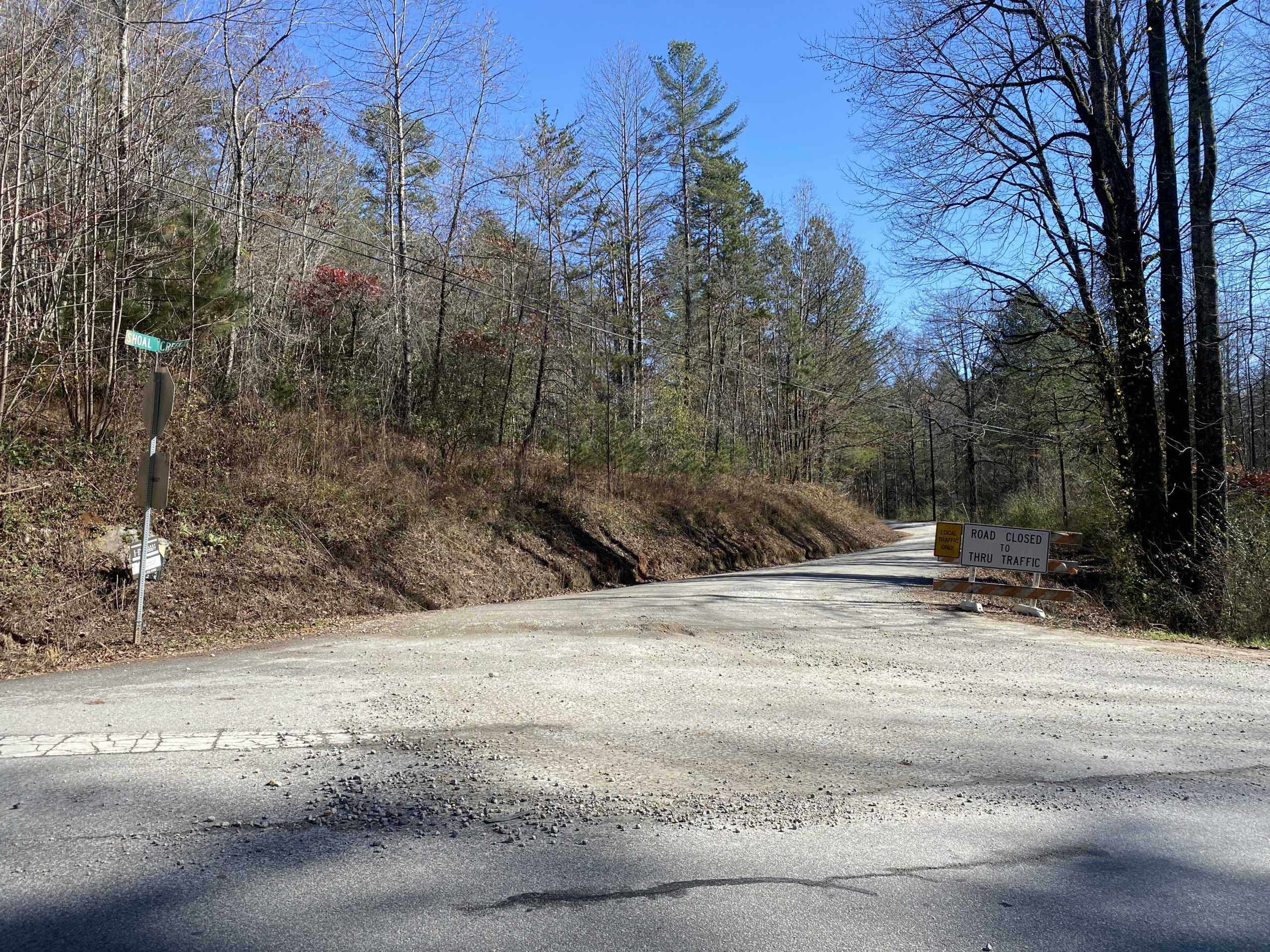 The damaged section of New Liberty Road has now been closed to through traffic for more than a month. The county shut down that section of the road on October 21 and set up a detour between Ben Jones and Shoal Creek Roads. Officials later adjusted the detour route to bypass Shoal Creek, which is gravel and was also damaged by the storm. The existing detour extends four miles north to Watts Mill Road and will remain in effect until New Liberty Road reopens.