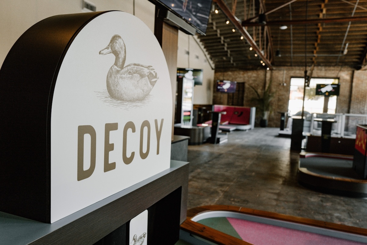 Decoy is open to the public now. It includes a large restaurant and 30-seat bear. Entertainment options include a 9-hole miniature golf course, six duckpin bowling lanes, two golf simulator bays, and a stage for live music. A separate area is also available for private parties and corporate events.