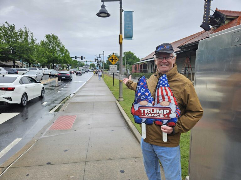 Further down the road, Woodstock resident John Thomas held a one-man counterprotest, holding up a sign with the Trump-Vance logo atop a pair of garden gnomes.