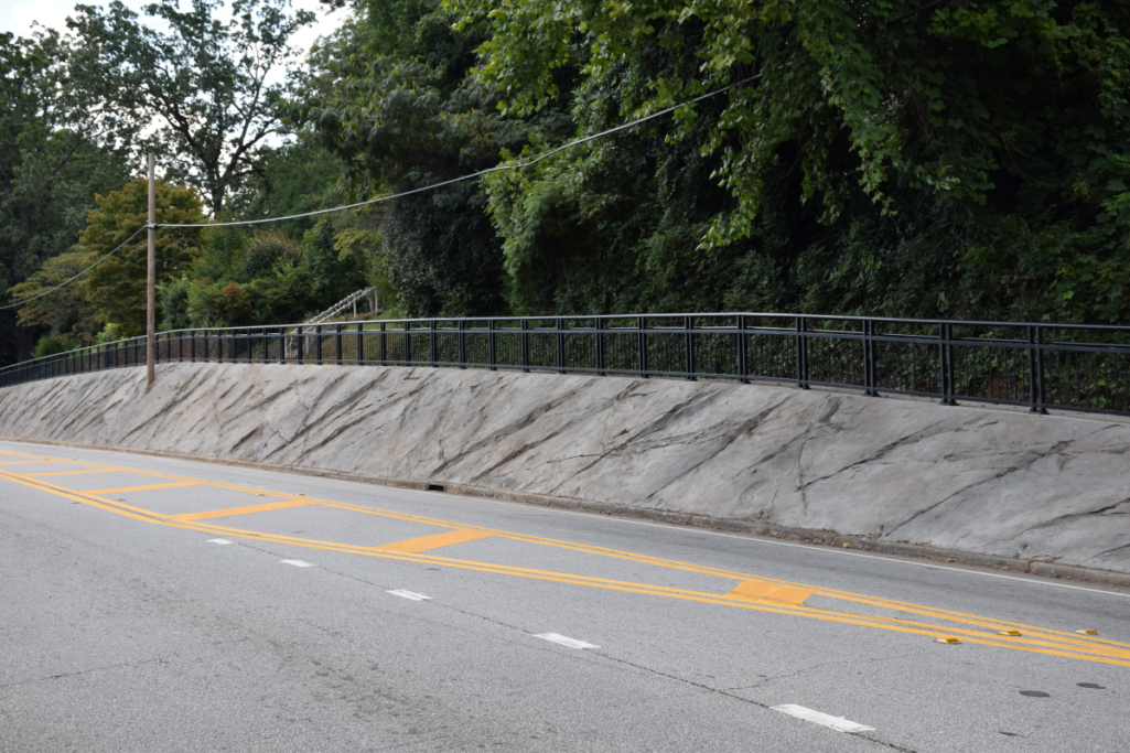 However, the wall sat idle again due to delays in shipping of the required hand railing located along the sidewalk at the top of the retaining wall. Another set back came when the sealant on a portion of the sealant was defective and had to be replaced, delaying the completion of the hand rail installation.