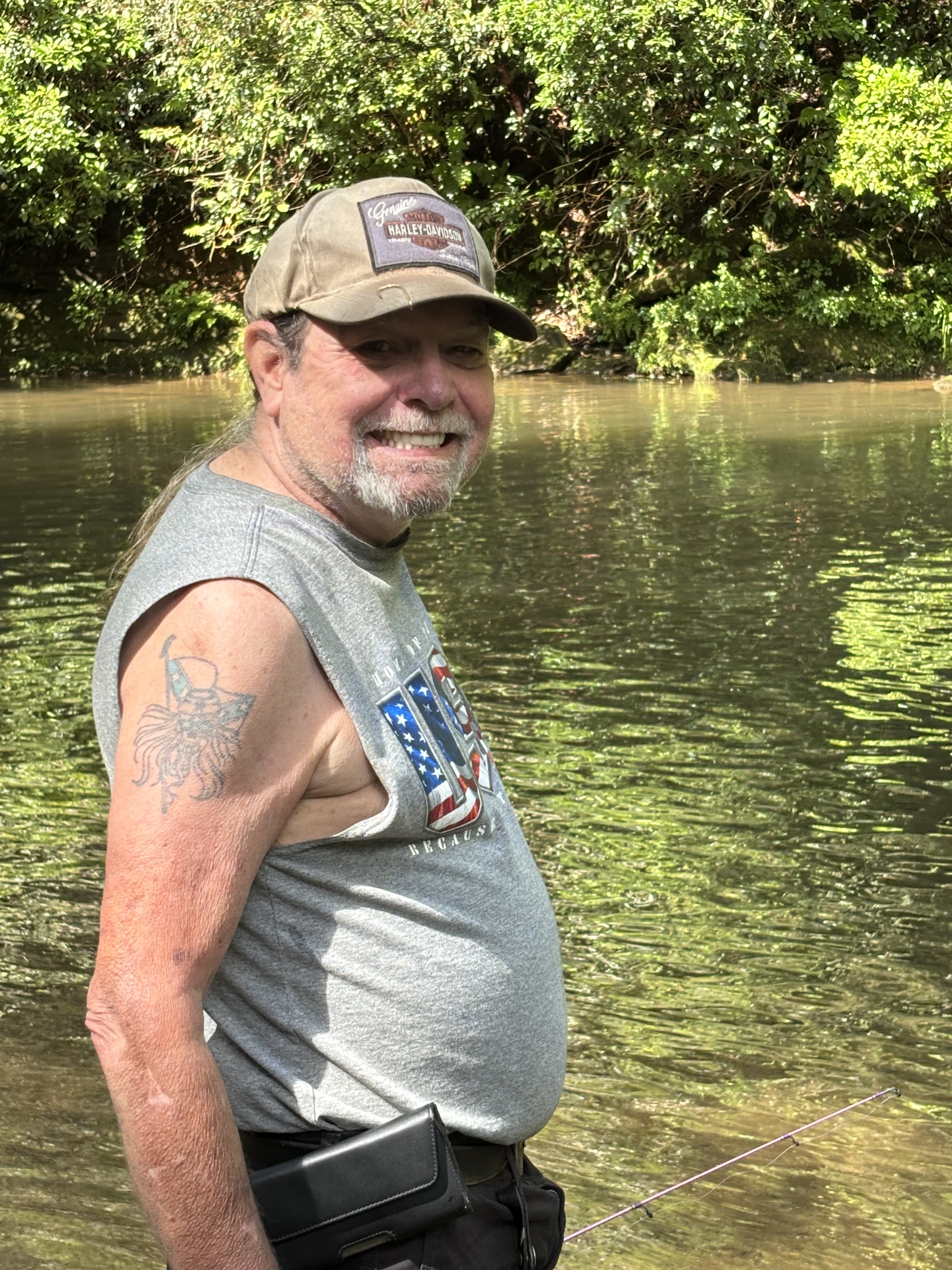 Russell Aiken of Martin, Georgia, was one of two fishermen enjoying leisure time near the Kelvin Jackson Bridge on the banks of the Soque, where it flows under Route 197, about nine miles north of Clarkesville.