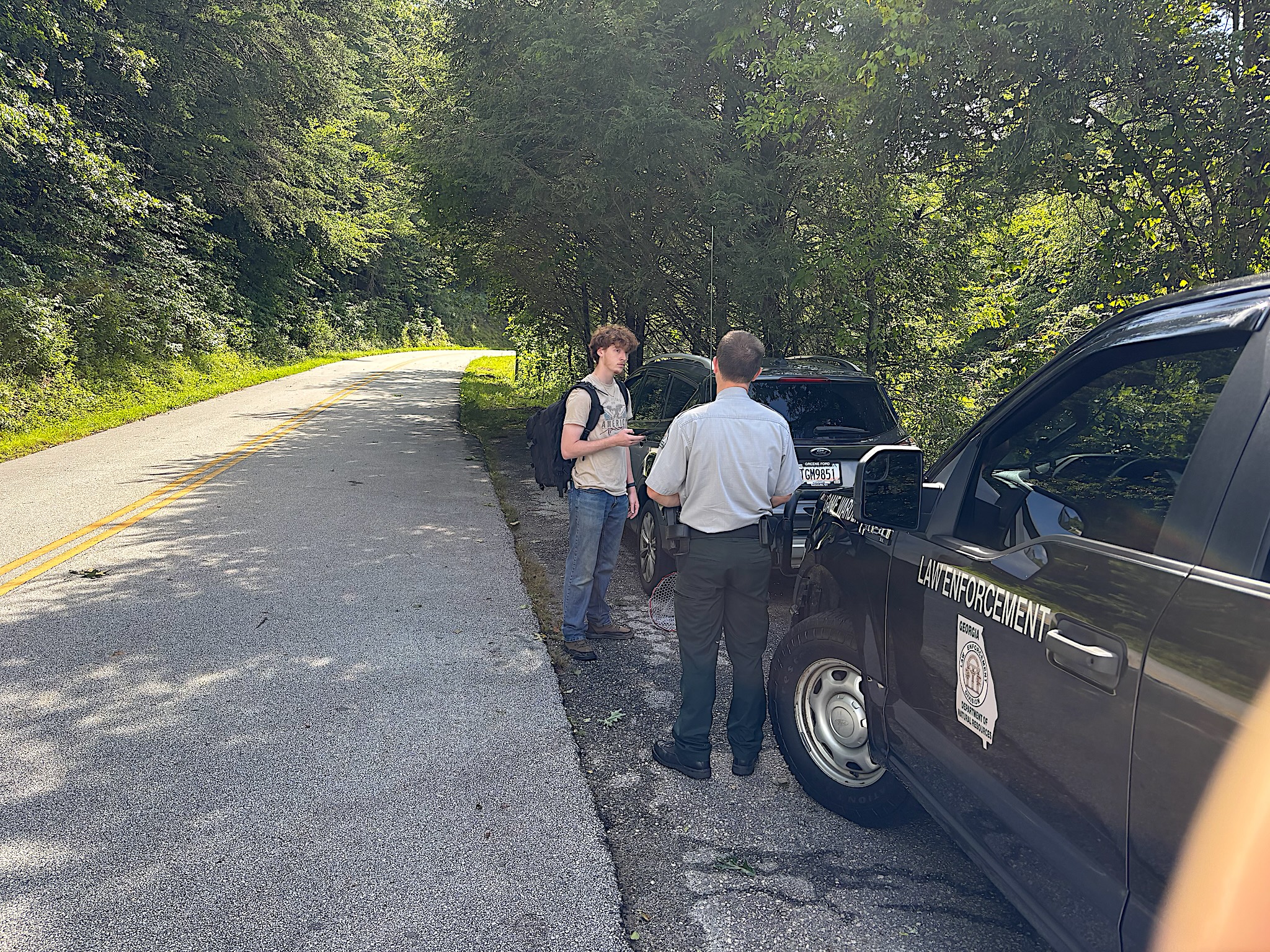 Fleming’s first two encounters with fishermen enjoying the cool waters and luring the abundant trout in the Soque River were met affably by the sportsmen, without incident. One, a student who’d stepped away from class at North Georgia Technical College, simply produced his license and moved on.
