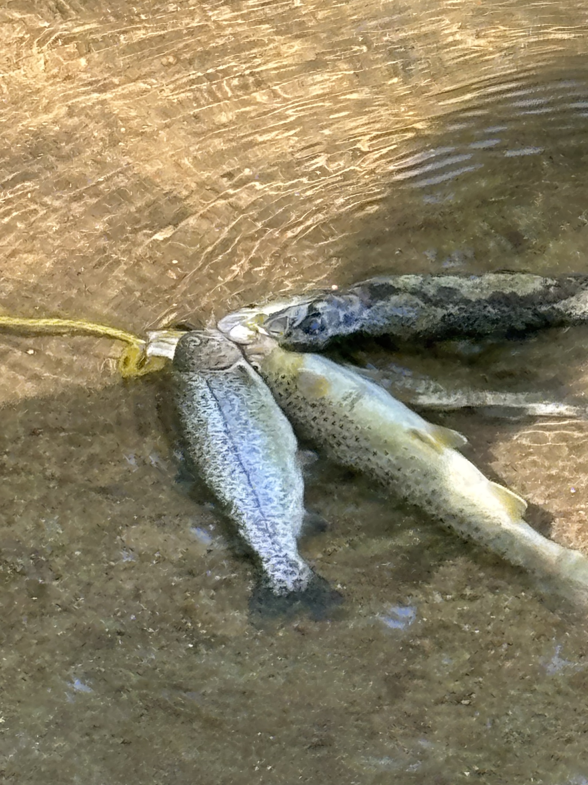 “This is my favorite creek,” said Aiken, who had the look of any aging “good ol’ boy,” and a thick accent to match. He gestured at the four rainbow and brown trout on a hook he’d already captured that day, one of them still flopping about, as it was submerged in the clear, shallow water. He said he fished a few times a week, and more often ever since an accident involving a horse forced his retirement.