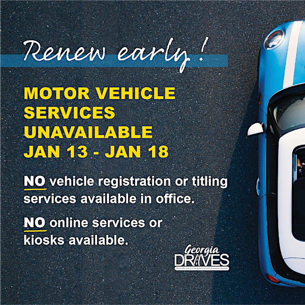 To avoid such delays, Georgia residents with January and February renewal dates are encouraged to renew prior to Wednesday, January 13. Customers and dealers seeking to conduct any title transactions should complete their business at a county tag office prior to the 13th.