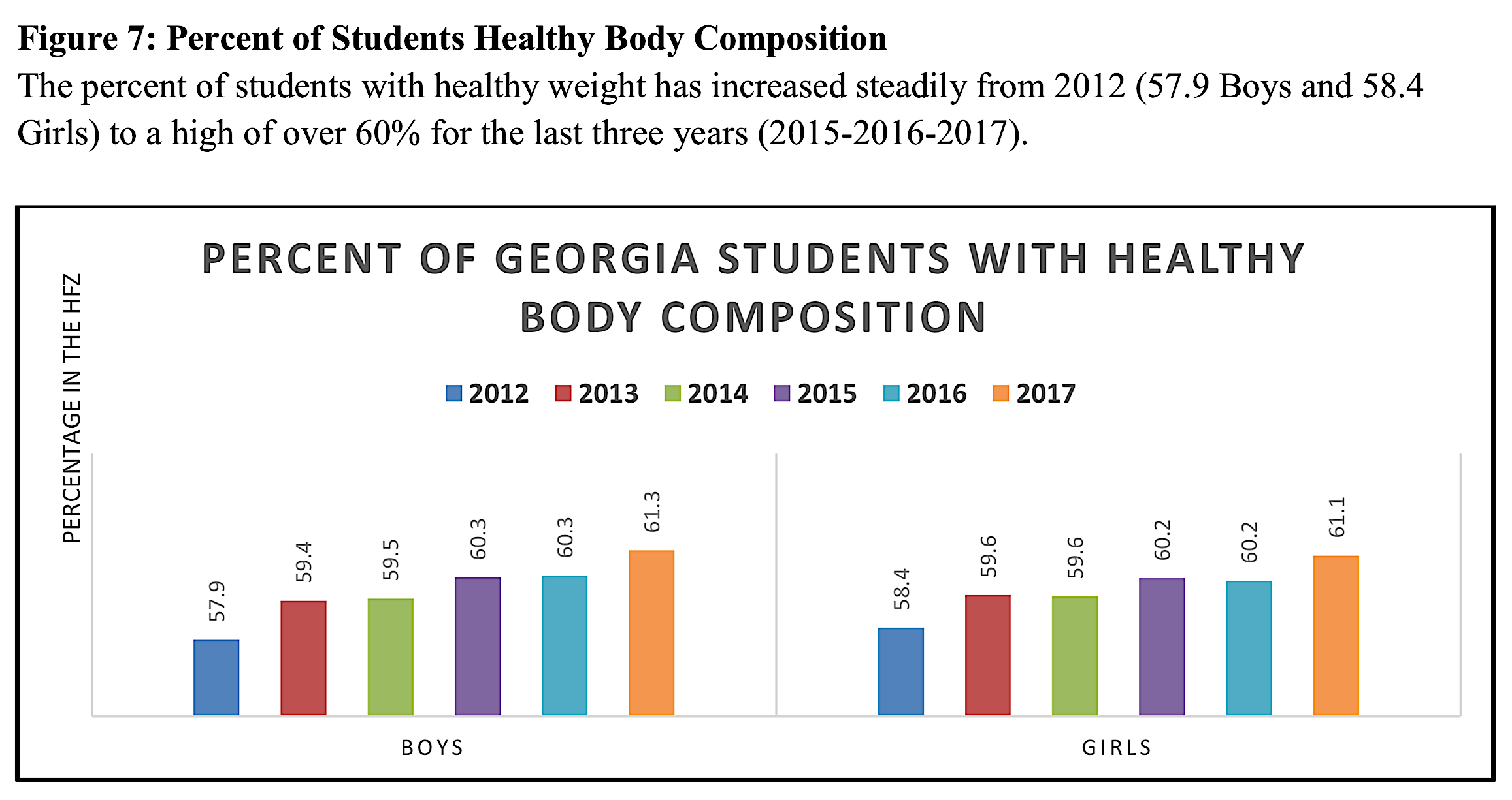 Georgia now has seven years of data using the Fitnessgram tool, which shows the percentage of students with healthy weight has increased steadily since 2012, Nydam said.