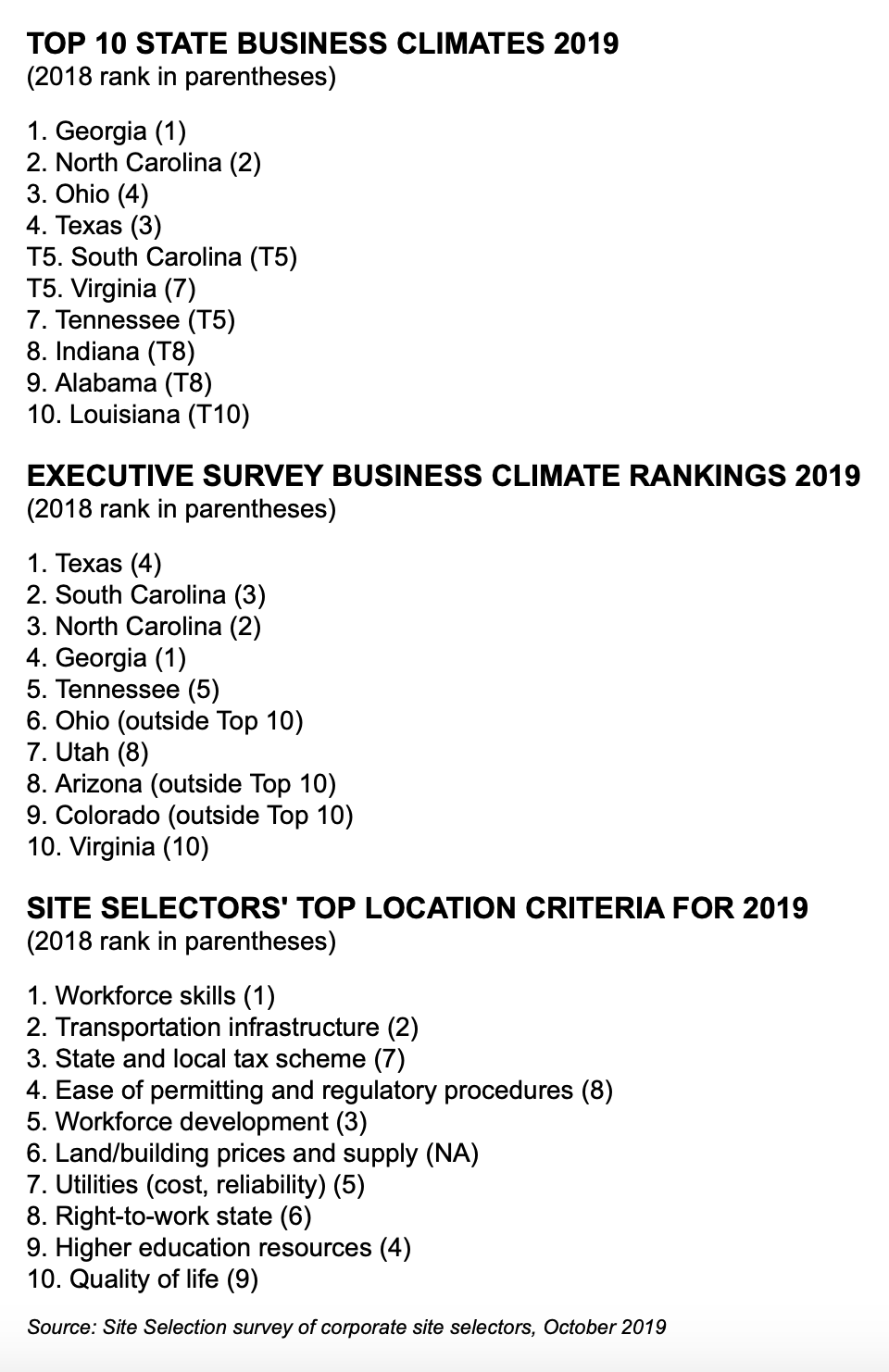 Site Selection releases its Top State Business Climate rankings each November. The rankings are 50 percent based on objective criteria and 50 percent on the input received from a survey of independent site location experts who are asked to rank and explain their choice.