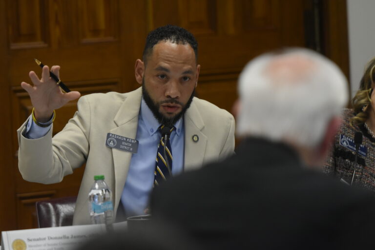 Sen. RaShaun Kemp debates with Sen. Max Burns over Burns’ anti-DEI bill. (Ross Williams/Georgia Recorder)