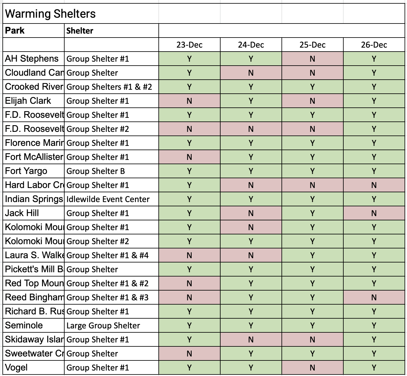 Availability of warming stations at Georgia State Parks as of 6:25 a.m. on Friday, Dec. 23, 2022. (Source: Georgia State Parks)