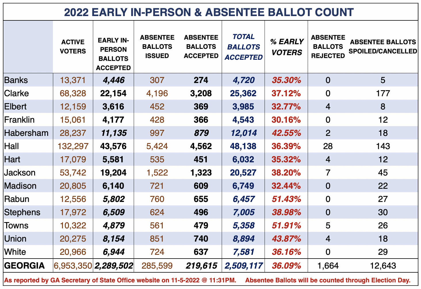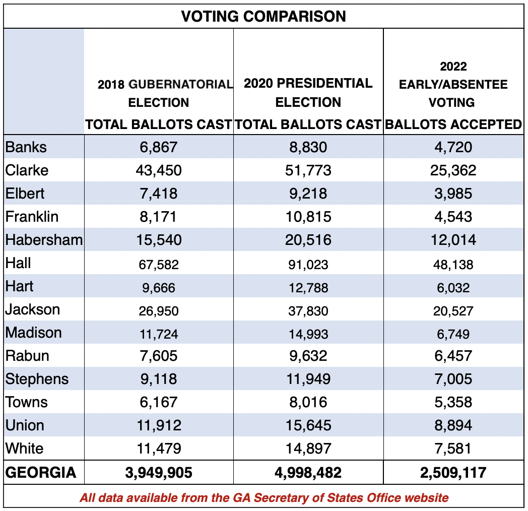 Northeast Georgia voters contributed to the high turnout, with over 51% of the voters in Rabun and Towns counties casting ballots ahead of election day. Habersham County recorded a nearly 43% early voter turnout. Of the 167,365 votes cast in the below-listed counties, 91% (152,317) were cast in person. There were 15,408 absentee ballots returned and accepted.