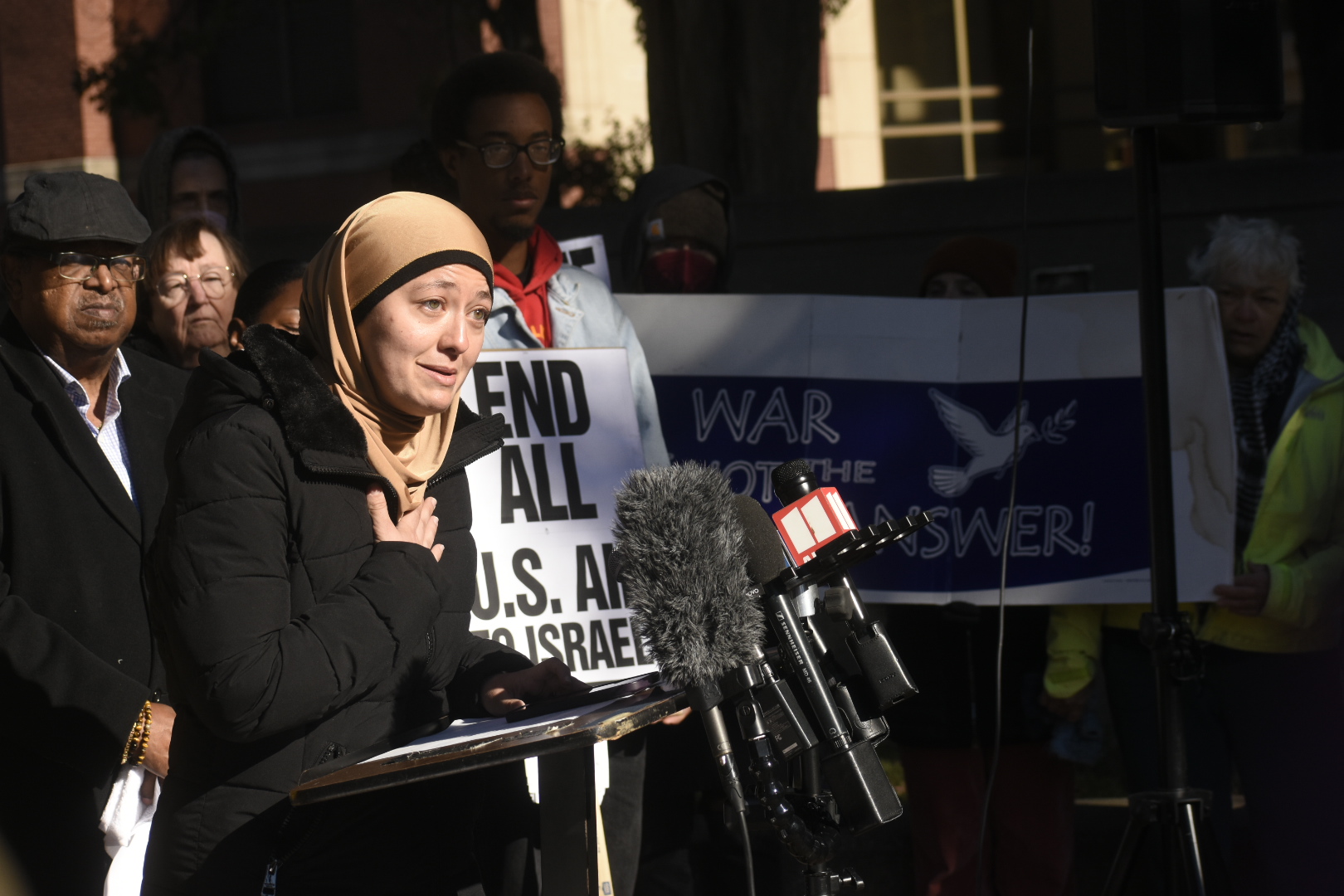 “We are mourning the over 8,000 killed in Gaza,” she added. “We are mourning the 1,400 and more killed in Israel. We refuse to allow our government and the government of Israel to twist our grief to justify this genocide against the Palestinian people. We must not forget our shared humanity in times of unspeakable loss. We know all too well the consequences of blind violence, and it is this that compels us to say, never again, never again for anyone, never again in Gaza, never again, especially in our name.”